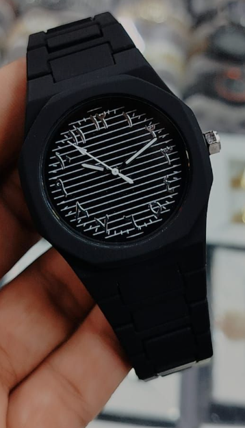 - Dial: The black dial uses Eastern Arabic numerals for the hour markers, which are printed with a unique striped or fiber-optic-like pattern, giving them a high-contrast appearance against horizontal lines.