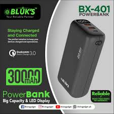 BLUK'S BX-401 is a 30,000mAh power bank featuring Qualcomm 3.0 Quick Charge and PD 22.5W technology. It has a large capacity suitable for multiple charges of smartphones and tablets.